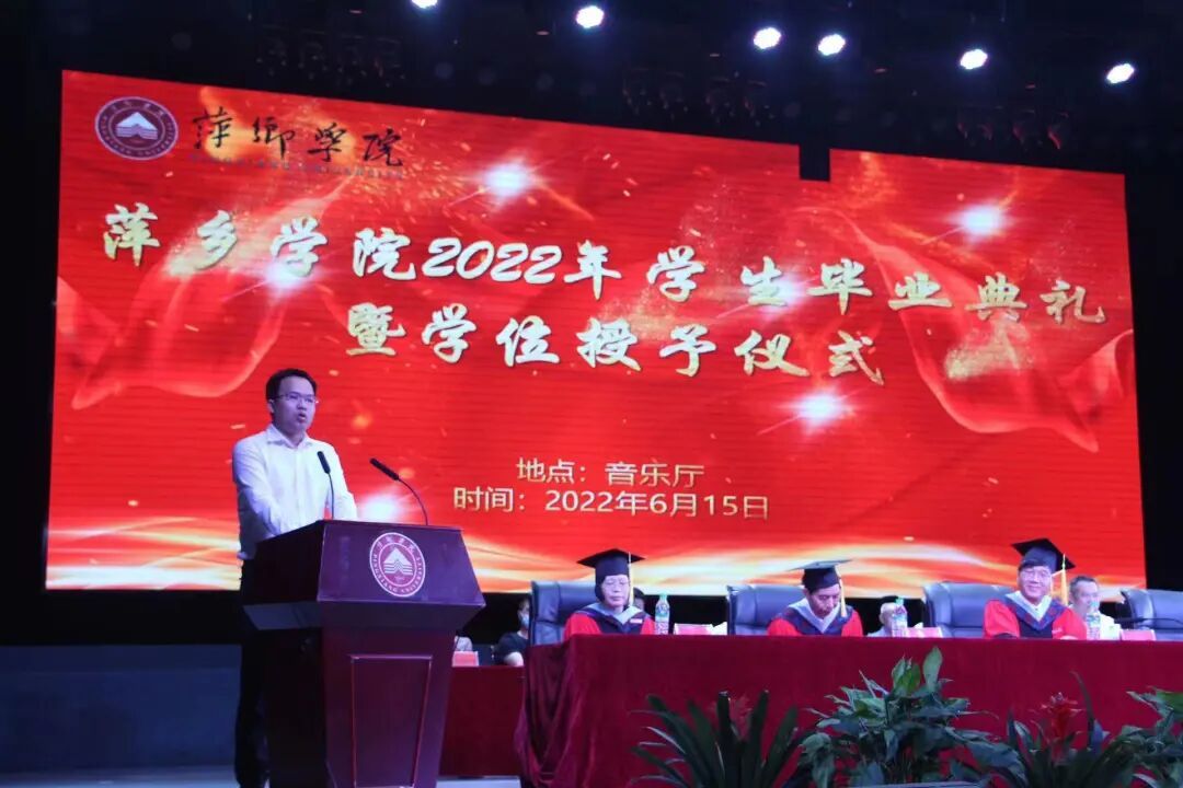 6月15日,萍乡学院2022年学生毕业典礼暨学位授予仪式在音乐厅隆重举行,99级生化教育专业校友刘水萍受邀参加并作《心怀梦想,矢志向上》的主题发言,他在发言中与2022届毕业生分享了自己的人生经历以及感悟,并对即将踏入社会的学弟学妹们提出了真诚的建议。