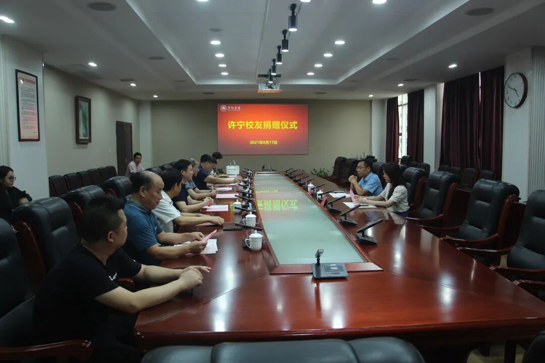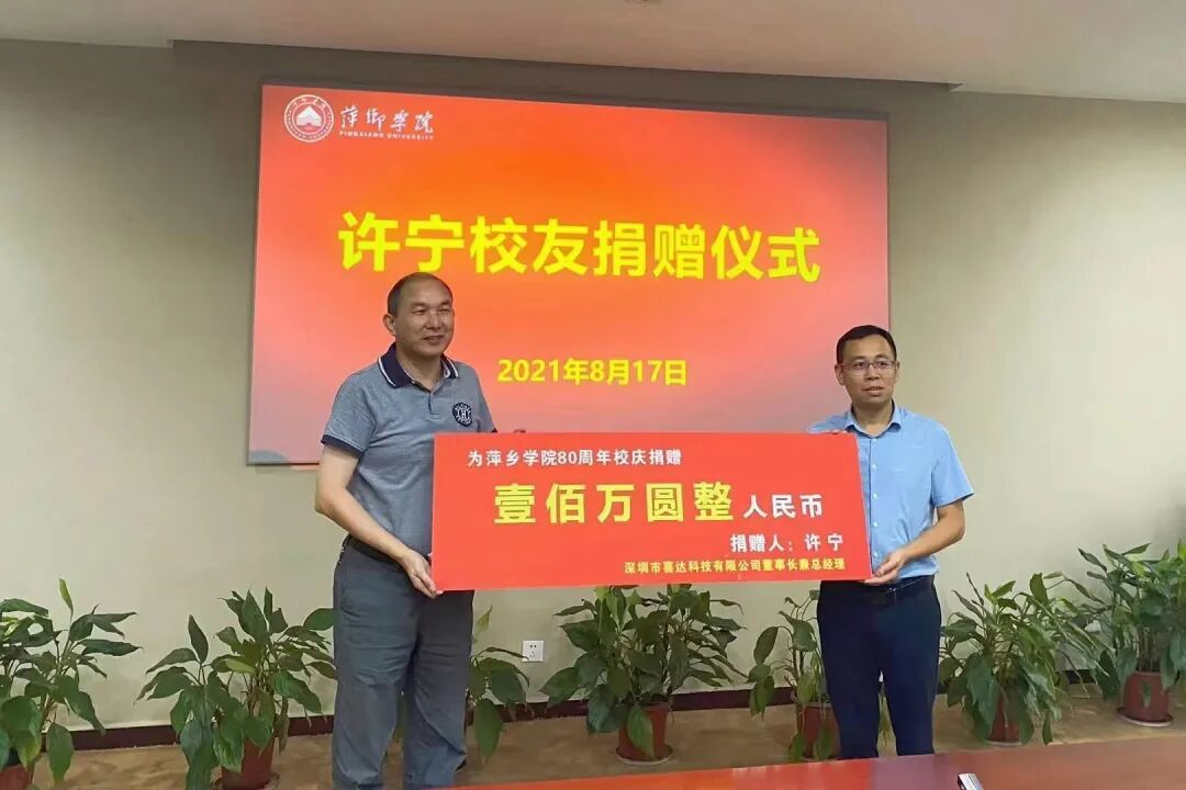今年是萍乡学院建校80周年。8月17日下午,许宁校友捐赠仪式在至善楼第一会议室举行。1995级英语教育专业校友、深圳市喜达科技有限公司董事长、总经理许宁与萍乡市教研室义教科科长李清校友出席捐赠仪式,校长史焕平,党委委员、副校长郭伟,党委委员、宣传部部长陈永国以及党政办主任向绍萍、计财处处长文发佑、招生就业处处长刘德平、校团委书记江惺俊、外国语学院党总支书记黄柏萍、招生就业处副处长黄红华、外国语学院副教授文华增和部分师生代表参加捐赠仪式。陈永国主持捐赠仪式。