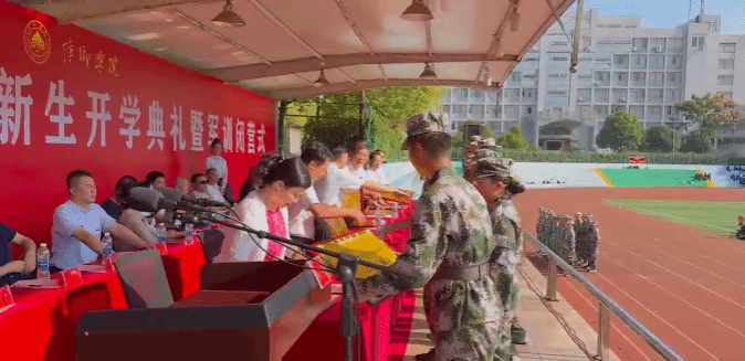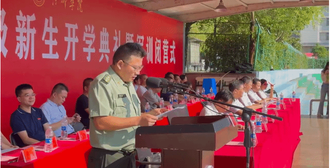 长风万里启新程,金秋送爽迎君来。9月24日上午,我校在第一田径场举行2024级新生开学典礼暨军训闭营式。校党委书记邱晓辉,副校长吴代赦,党委委员、副校长陈永国,党委委员、纪委书记郑伟,党委委员、宣传部部长曾敏,党委委员、统战部部长、教务处长贺晓梅,校友代表刘冬萍出席典礼。学校相关部门负责人,各二级学院党委书记、副书记,新生辅导员以及全体教官和2024级新生参加典礼。典礼由陈永国主持。