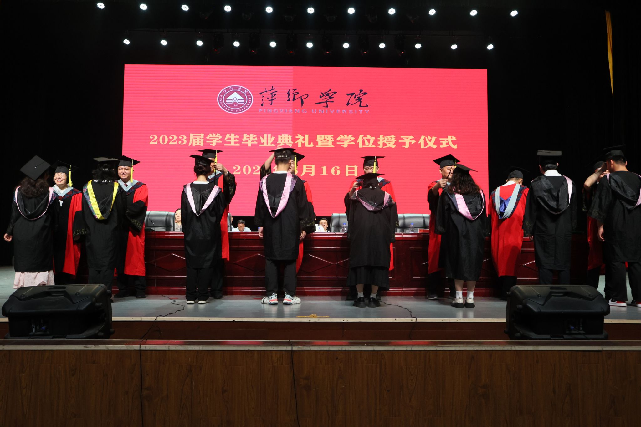 伴随着音乐声,毕业生代表们有序登台进行拨流苏受礼,并庄重接过毕业证书和学位证书。