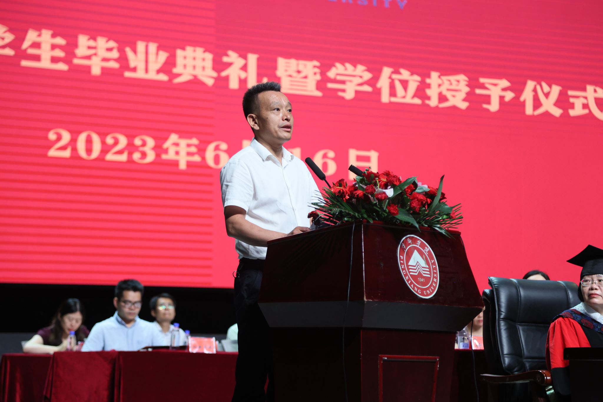 学业终有尽,青春不散场。 6月16日上午,我校2023届学生毕业典礼暨学位授予仪式在音乐厅举行。校领导邱晓辉、刘林芽、郭伟、潘运华、陈永国、刘培圣、陈永秀、王林清出席毕业典礼。各二级学院党委书记、院长、党委副书记、相关部门负责人,校友代表、教师代表、毕业生代表和非毕业生代表现场参加典礼。典礼由校党委委员、副校长陈永国主持。