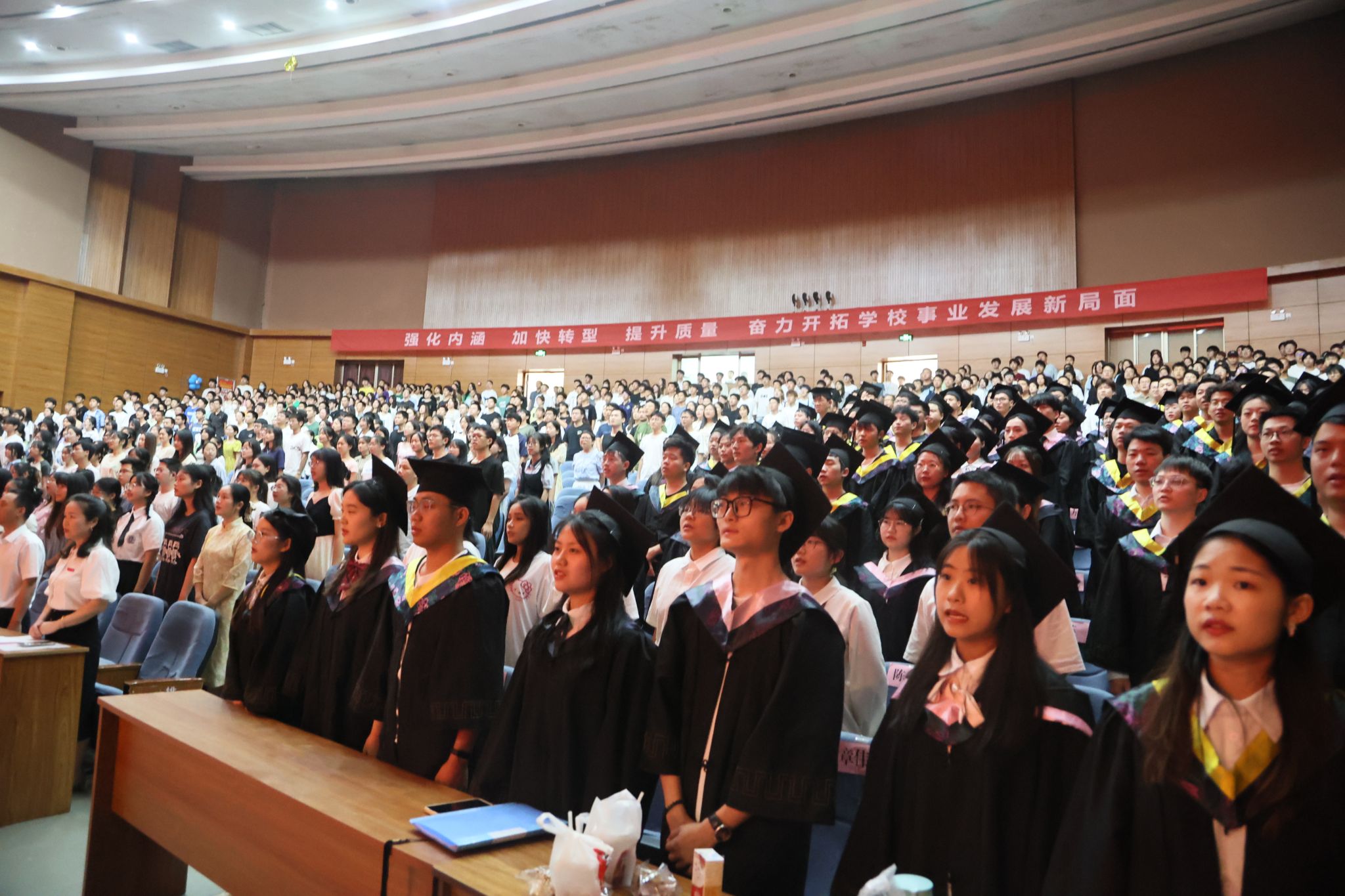 在集体合唱《青春起航》的校歌旋律中,毕业典礼徐徐落下帷幕。主席台领导、嘉宾起立挥手欢送毕业生,共同祝福他们前程似锦、一路繁花!