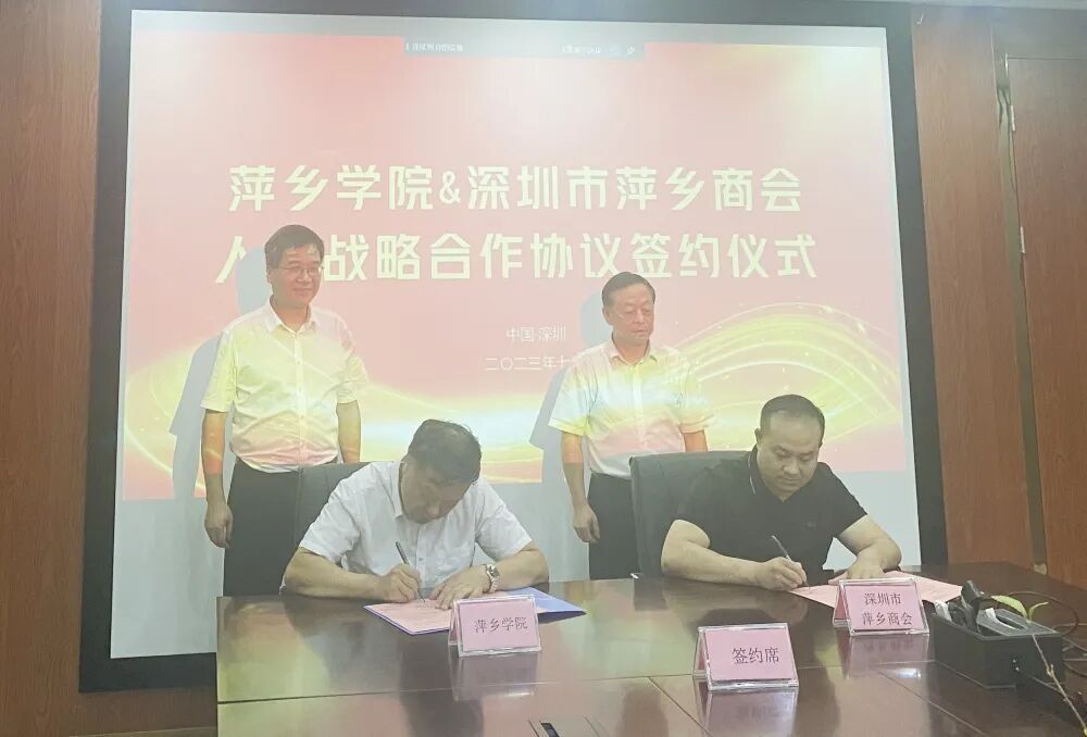 邱晓辉一行首先来到深圳市萍乡商会,参观了商会办公场所,了解了商会秘书处人员配备、服务功能和活动成效,并举行了萍乡学院与深圳市萍乡商会人才战略合作协议签约仪式,向深圳市萍乡商会颁发了“萍乡学院毕业生就业基地”牌匾。